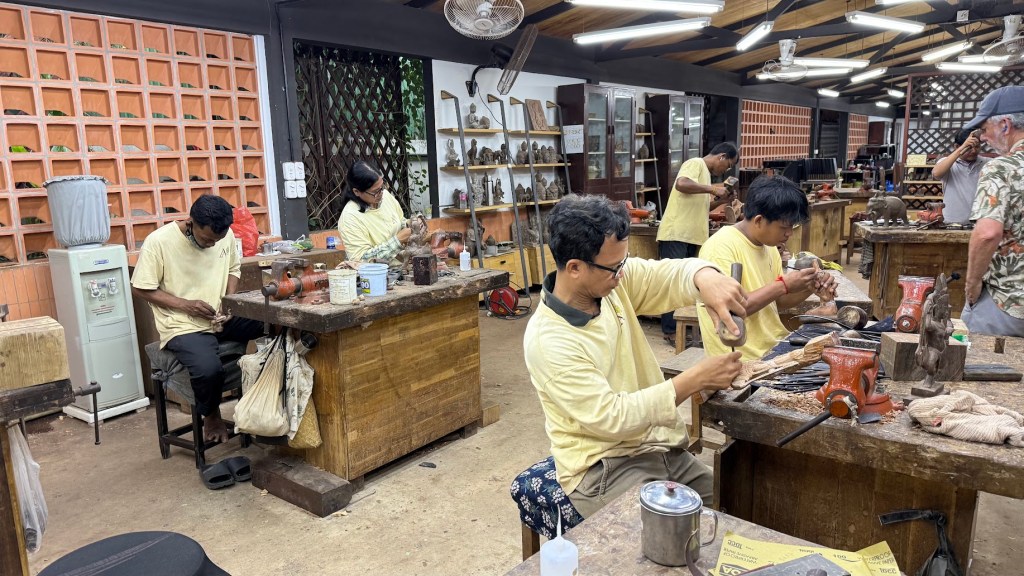 Fomos até as oficinas da Artisans Angkor, uma iniciativa dedicada à preservação e revitalização do artesanato tradicional khmer. No local, acompanhamos de perto técnicas manuais que fazem parte da herança cultural do Camboja, como esculturas em pedra e madeira, trabalhos em laca, pinturas em seda e outras formas de produção artesanal. Tudo é realizado por artesãos locais, treinados em métodos tradicionais que estavam em risco de desaparecer. Além de funcionar como centro de capacitação profissional, a Artisans Angkor também oferece aos visitantes a possibilidade de adquirir peças produzidas ali mesmo, contribuindo para a economia local e para a continuidade dessas práticas culturais.