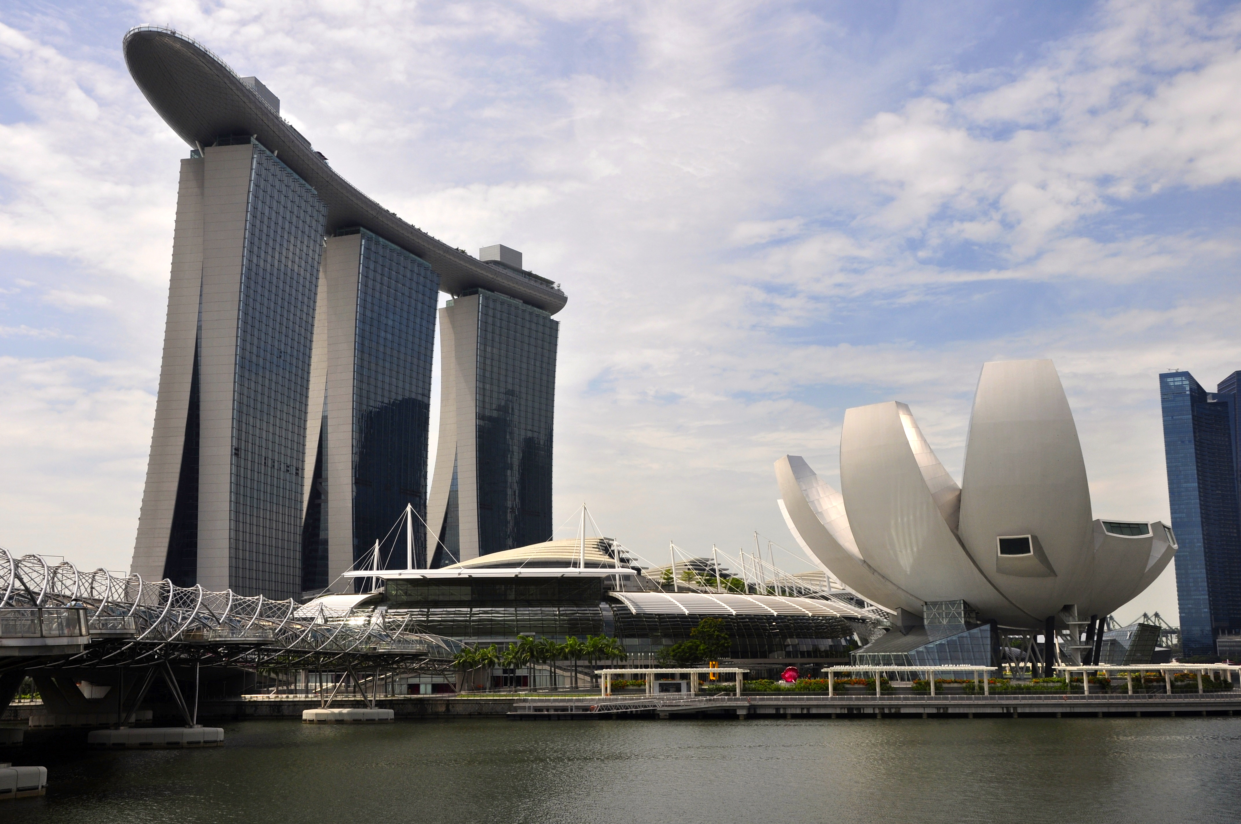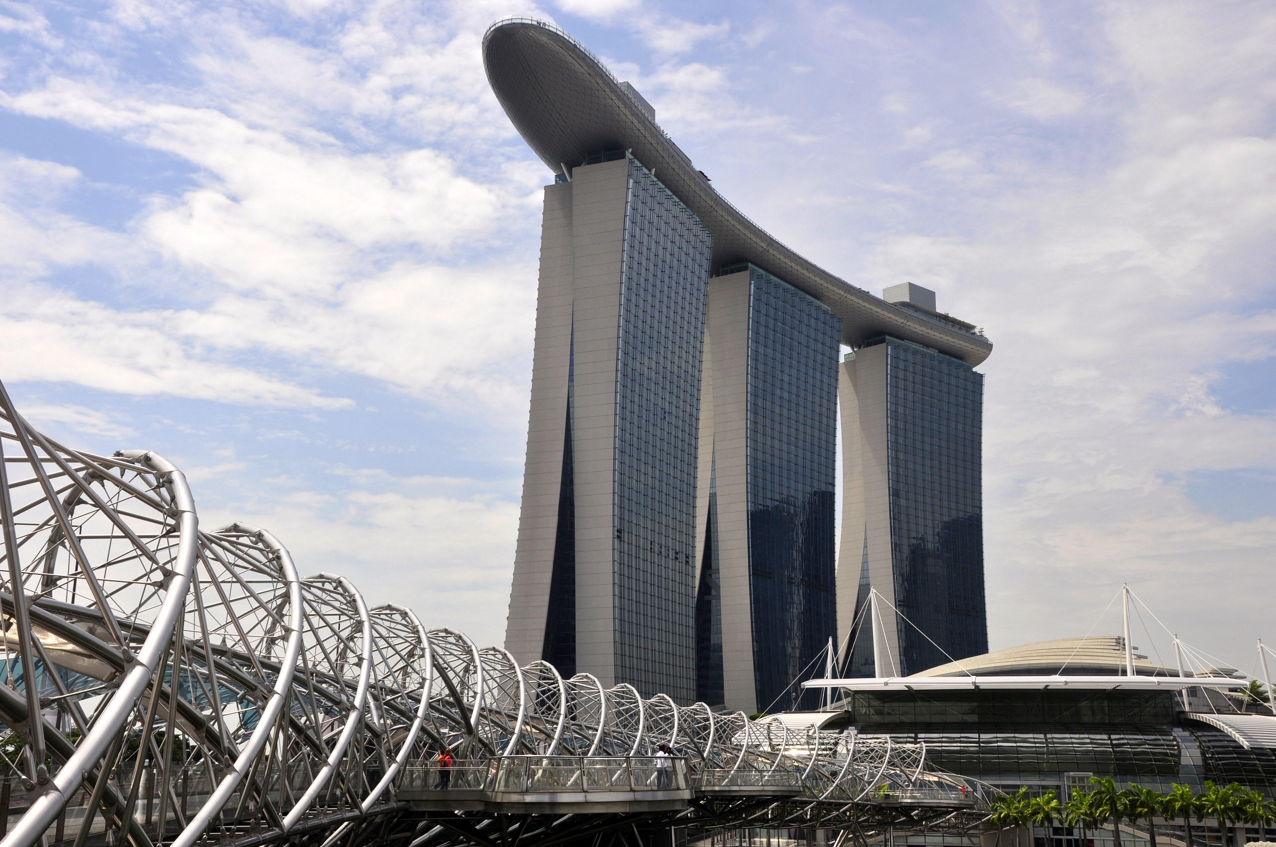 Dentre os prédios imponentes e de arquitetura moderna de Singapura, o mais impressionante é o Marina Bay Sands. São três torres de 57 andares cada uma delas, onde funcionam hotéis, escritórios e Shopping Center, além do principal cassino da cidade.
