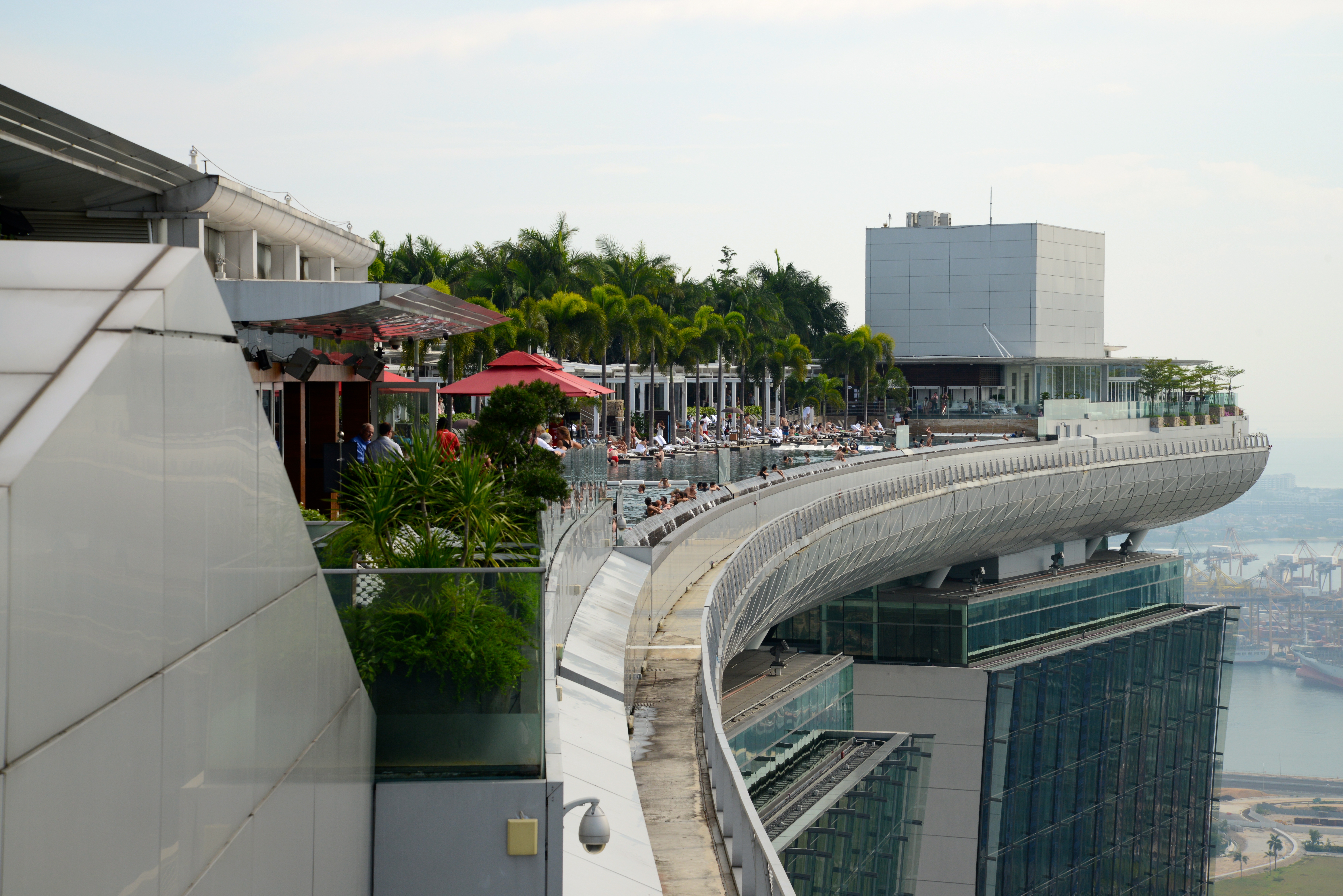 No alto das torres, uma plataforma curva, em forma de barco complementa o detalhe arquitetônico. O projeto é da Safdie Architects. Hoje é o maior símbolo da cidade. Nessa plataforma funcionam serviços: Restaurantes, bares, discotecas e uma piscina maravilhosa, com borda infinita e um espetacular mirante para a cidade.