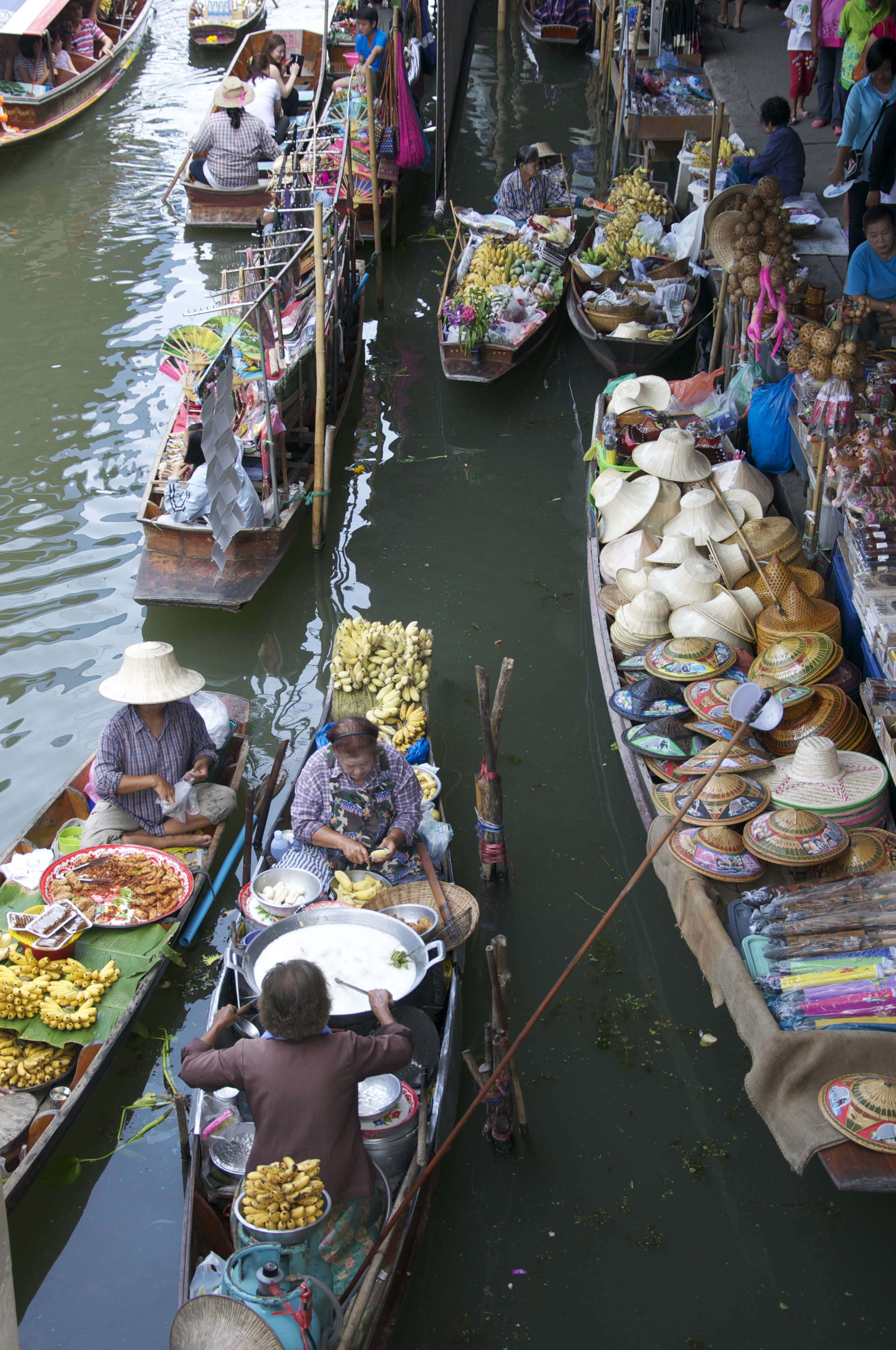 Existem dezenas de pequenos barcos de madeira, a maioria movidos a remo por mulheres que vão até Damnoen Saduak para vender de tudo: Frutas, comida, peixes, plantas, roupas, etc.