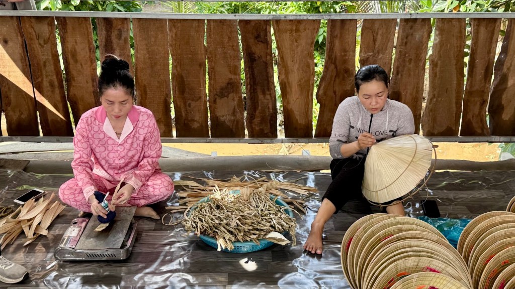 Na Ilha Gieng, circulamos de tuk tuk pelas estradinhas sombreadas, cercadas por plantações e vilarejos tranquilos. Em um dos pontos da visita, paramos para observar artesãos confeccionando os tradicionais chapéus vietnamitas. O trabalho é delicado e minucioso: as finas tiras de bambu são entrelaçadas e cobertas com folhas secas, moldadas com paciência e precisão. Cada chapéu carrega a simplicidade e a identidade cultural do Vietnã, símbolo do dia a dia rural e da elegância discreta de seu povo.