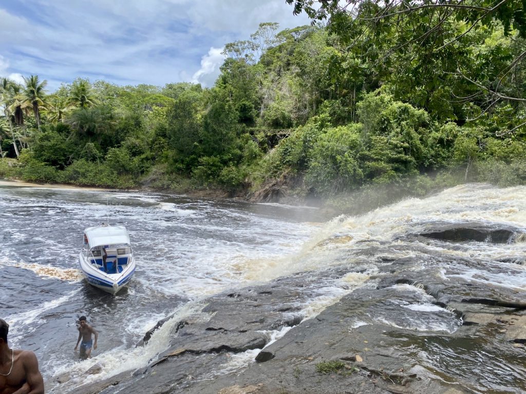 Seguimos até a Cachoeira do Tremembé, na foz do Rio Araú, na Ilha Veneza, dentro da Baía de Camamu. O rio deságua nessa formação inusitada. As lanchas encostam na cachoeira que possui 30 metros de largura e 5 metros de altura. É possível tomar um banho maravilhoso sem sair da lancha.