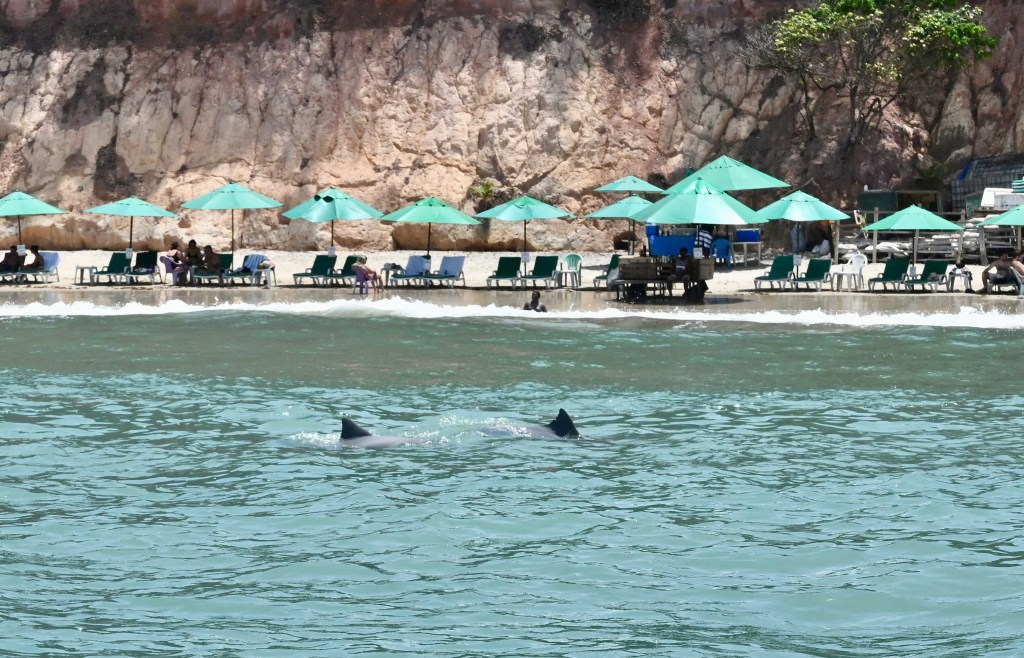 Seguimos até a Baía dos Golfinhos, uma das mais famosas praias de Pipa. Já foi eleita pelo Trip Advisor, como uma das melhores praias do mundo. Exagero, mas vale a pena conhecer. Avistar os golfinhos por lá é sempre muito fácil. Eles vivem ali. Ficamos procurando os golfinhos, que de vez em quando apareciam para uma fotografia, mas estava muito desagradável, pois o mar muito movimentado não dava trégua. Não tivemos sossego. Tomamos um banho de meia hora e depois voltamos até a Praia do Centro para encerrar o passeio.