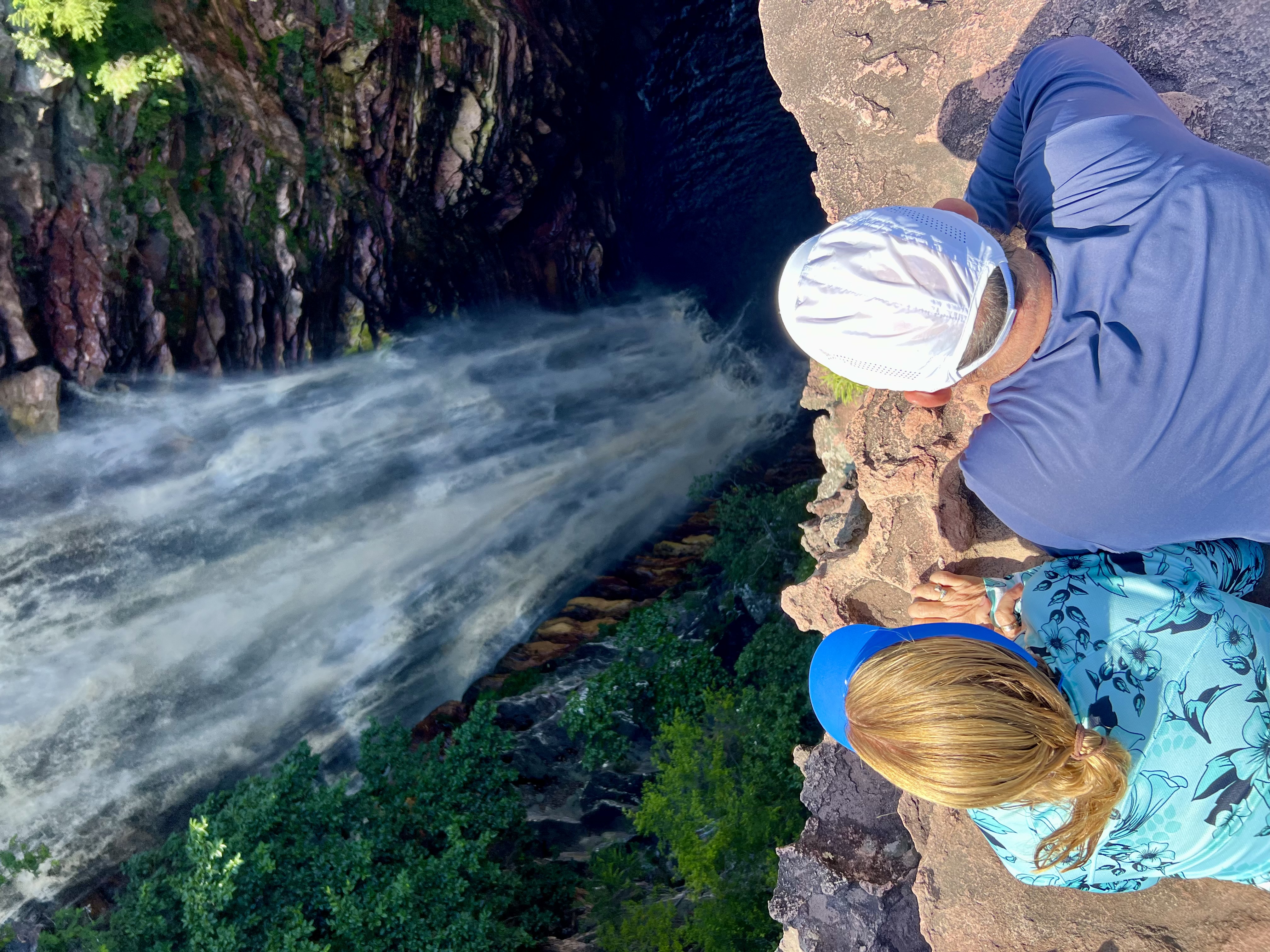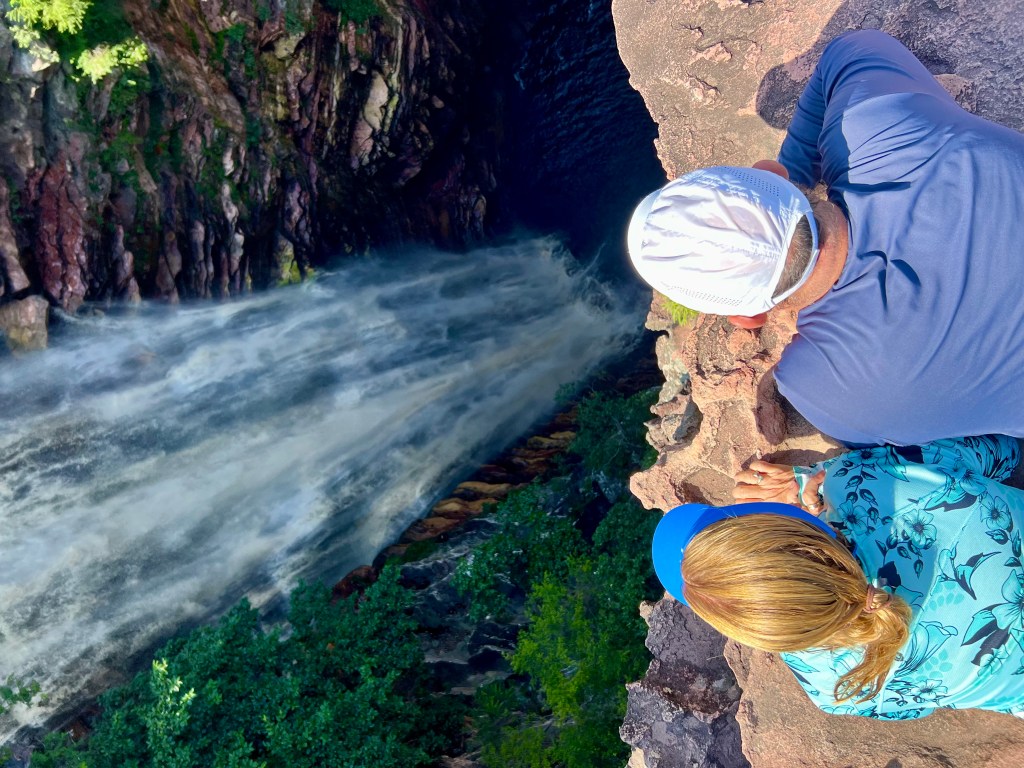Depois que subimos a parte mais íngreme da trilha, chegamos à parte alta da Cachoeira do Buracão. Ficamos na borda do precipício. Lá de cima dá para entender a magia do lugar. A natureza aqui foi perfeita e caprichosa. A cachoeira despenca de uma altura de 85m. É possível ficar bem na borda e ter uma sensação única da altura e do movimento das águas.