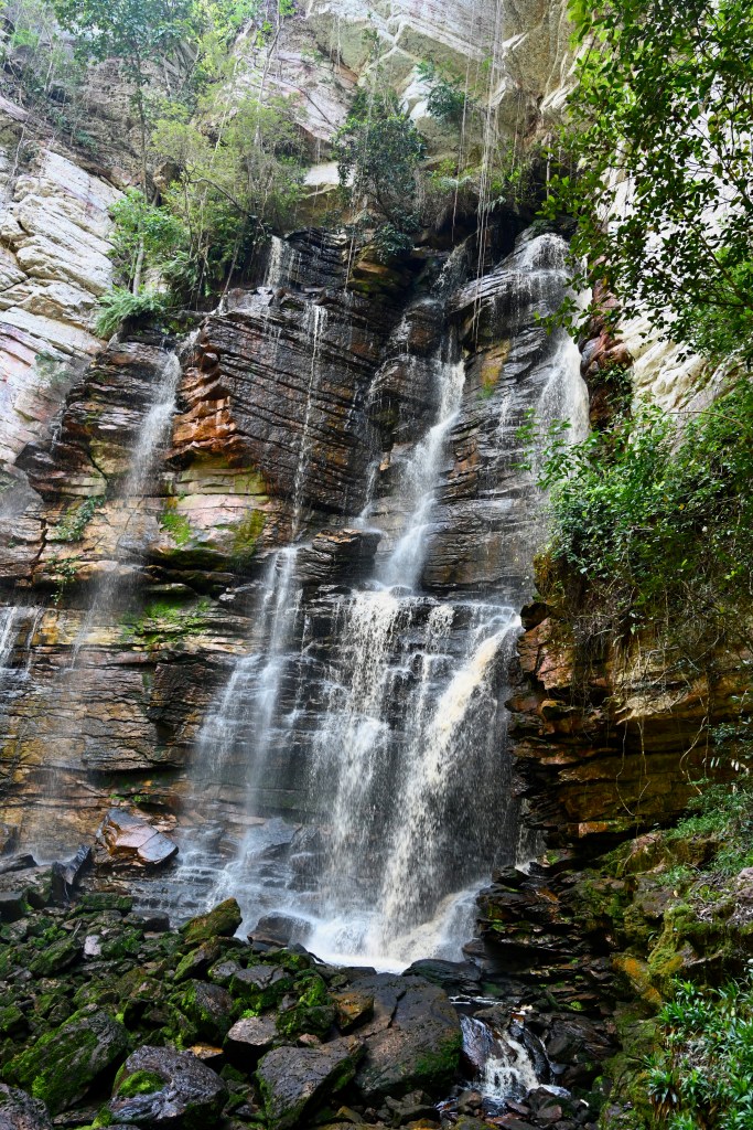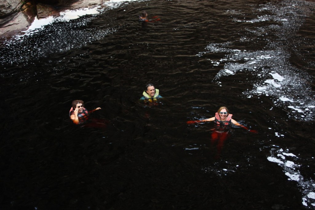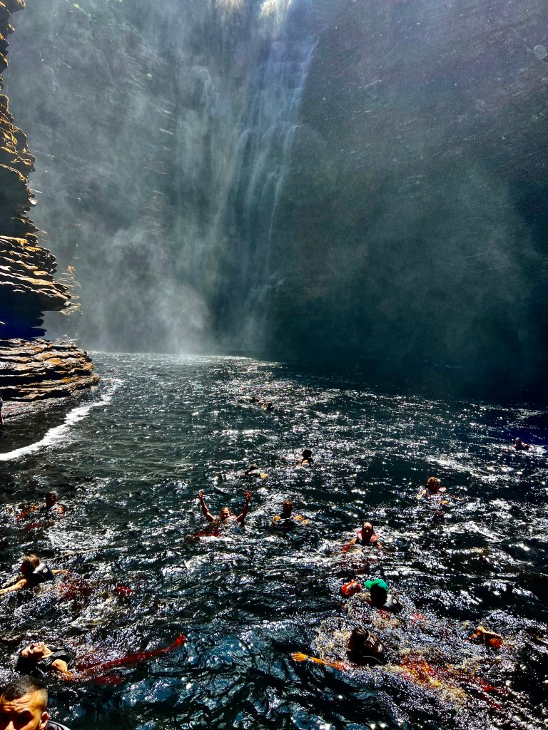 A água é gelada, mas não dá para chegar aqui e não experimentar. Nadamos até a base da cachoeira e ficamos por algum tempo tomando banho naquela ducha maravilhosa, com a sensação de que “o melhor lugar do mundo é aqui e agora”.