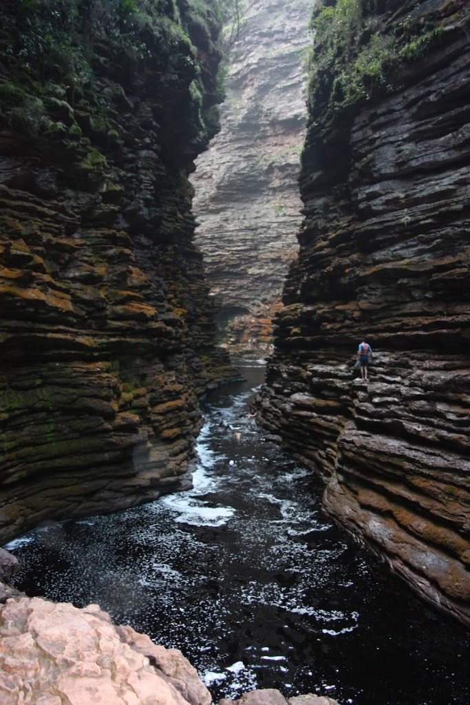 Continuamos colados ao paredão da rocha, pela parede do cânion. São cerca de 200m até aparecer a imagem mágica. Um imenso buraco cavado pela água, com aproximadamente 50m de diâmetro. Ao fundo despenca a cachoeira com 85m de altura. A água sai dessa área pelo cânion, rio abaixo.