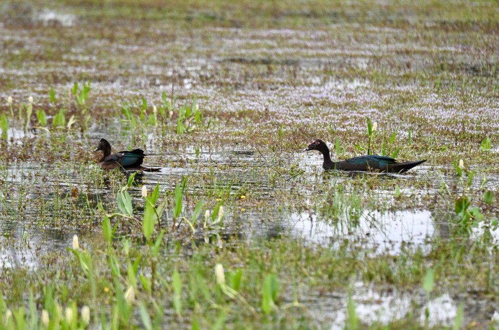 O Pato-do-mato também é abundante nas lagoas e banhados da fazenda. Possui uma coloração escura, mesclando a plumagem entre o preto e o verde escuro. Aparece de forma muito comum nas lagoas do Pantanal. São selvagens, mas convivem muito bem com a presença humana.