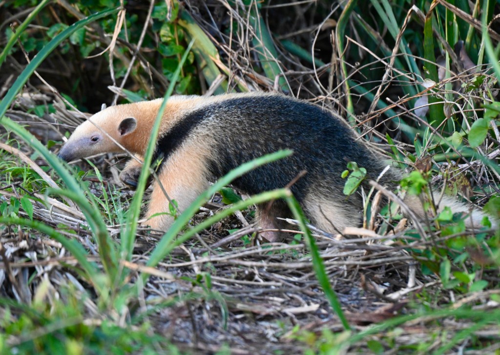 Voltamos para o carro e continuamos a nossa busca. De repente o Hélio, o nosso guia experiente, viu algo se mexendo por trás de umas moitas. Quando voltamos para observar, demos de frente com um Tamanduá-mirim, ou Tamanduá-de-colete. Um animal belíssimo, com uma pelagem dourada e preta, que pode chegar a mais de um metro de comprimento.