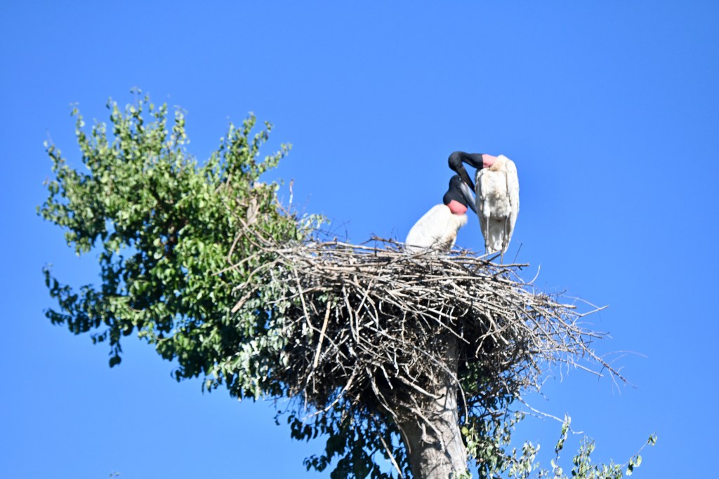 Ao longo da viagem que fizemos de uma semana pelo Pantanal, vimos diversos ninhos de tuiuiús. Em todos eles, o casal estava trabalhando para iniciar o período de reprodução, que acontece durante a estação seca, quando é mais fácil para essas aves se alimentarem. O interior dos ninhos é forrado com capim e plantas aquáticas para a postura de até 4 ovos, que são incubados por 60 dias.
