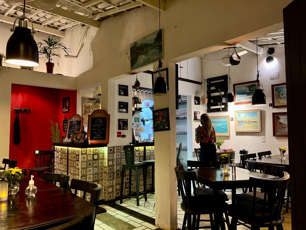 Jantamos no excelente Restaurante Chez Marília, de cozinha francesa, localizado numa das pequenas transversais da rua principal, a famosa Rua do Céu, pavimentada por paralelepípedos pintados em cores diversas.