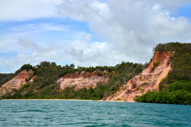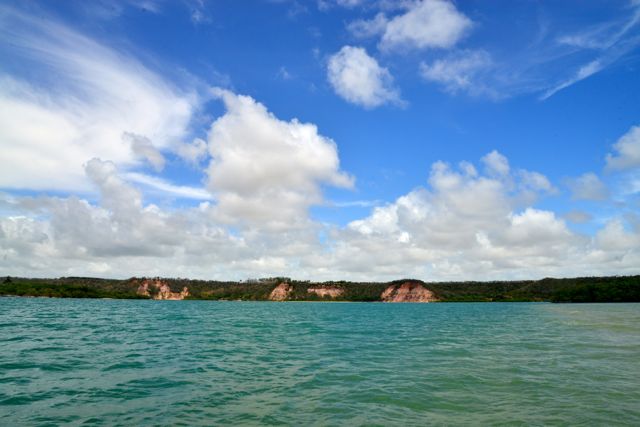 Seguimos bordejando a laguna e passamos embaixo das falésias sobre as quais fica o Hotel Gungaporanga. O terreno sedimentar da falésia deixa manchas coloridas na rocha exposta. É uma parada obrigatória para quem faz o passeio de barco, pois possibilita boas fotos.