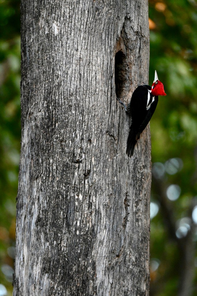 Num tronco em frente à recepção da pousada, paramos para observar um pica-pau-de-topete-vermelho que fazia um ninho no tronco da árvore, cavando vigorosamente com o bico e fazendo um trabalho artesanal. Essa ave pode chegar a 38 cm de comprimento, consegue pousar verticalmente nos troncos das árvores, onde faz o seu trabalho. A batida repetida do bico na árvore, soa como o canto do pica-pau.