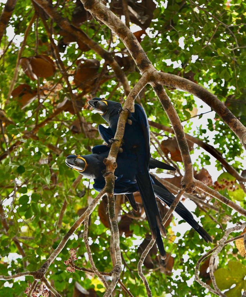Voltamos da trilha a tempo de observar um casal de araras-azuis protegendo um grande ninho numa das árvores no “quintal” da Pousada Aymara. A arara-azul continua no rol dos animais ameaçados de extinção, hoje é considerada uma ave “vulnerável”, em função da diminuição dos seus habitats naturais e do comércio ilegal. A população desses animais tem aumentado como consequência da existência de programas de conservação, sobretudo no Pantanal.