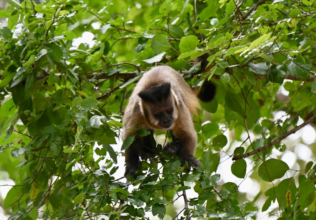 Seguimos por uma trilha pelo meio da mata, à tarde, na área do hotel. Sempre acompanhados por alguns macacos e papagaios. O macaco-prego-de-azara está presente em toda a extensão do Pantanal e era abundante na área da Pousada Aymara. Nos acompanhou ao longo da trilha. Possui cerca de 40 cm de comprimento corporal e 42 cm de cauda.