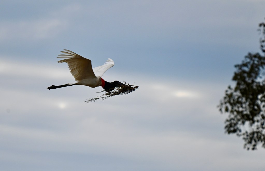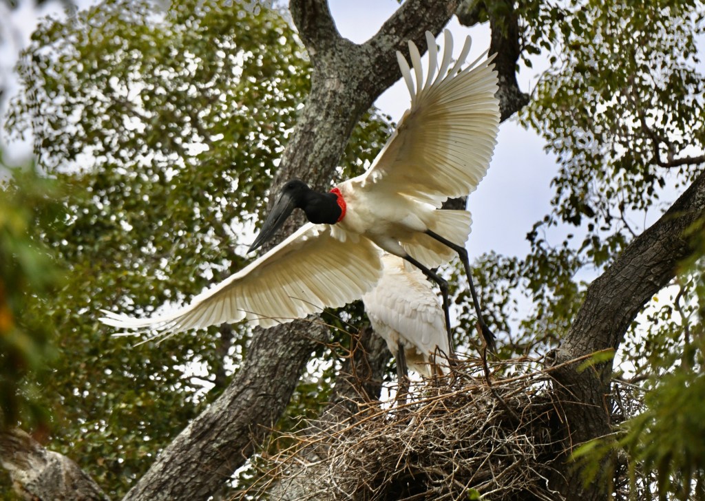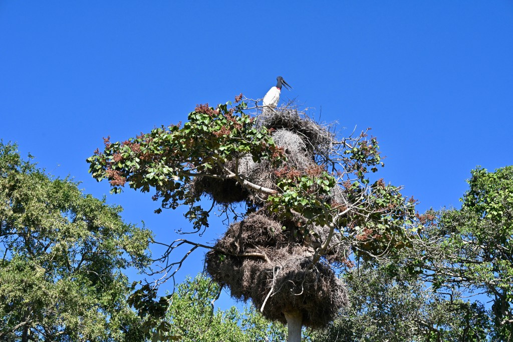 Ao longo da viagem que fizemos de uma semana pelo Pantanal, vimos diversos ninhos de tuiuiús. Em todos eles, o casal estava trabalhando para iniciar o período de reprodução, que acontece durante a estação seca, quando é mais fácil para essas aves se alimentarem. O interior dos ninhos é forrado com capim e plantas aquáticas para a postura de até 4 ovos, que são incubados por 60 dias. Os filhotes saem do ninho com três meses de idade e são acompanhados dos pais nas primeiras semanas de vida.