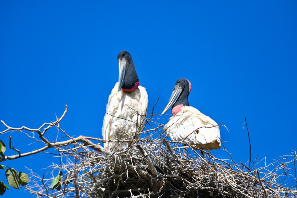 Costumam fazer os seus ninhos no alto das árvores em lugares de fácil observação, para que possam proteger os seus ovos e filhotes, de eventuais predadores. O ninho desse casal de tuiuiús estava lá, no alto de uma árvore, na beira da estrada. Foi maravilhoso flagrar as aves recompondo os ninhos, pois estava começando o período de nidificação. Enquanto uma das aves cuida do ninho, a outra desce para a pastagem para coletar material que possa reforçar a sua construção. A cada ano acrescentam mais galhos e outros materiais, reforçando os seus ninhos. São as maiores estruturas construídas por aves no Pantanal.