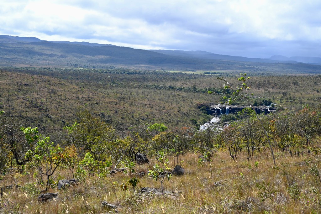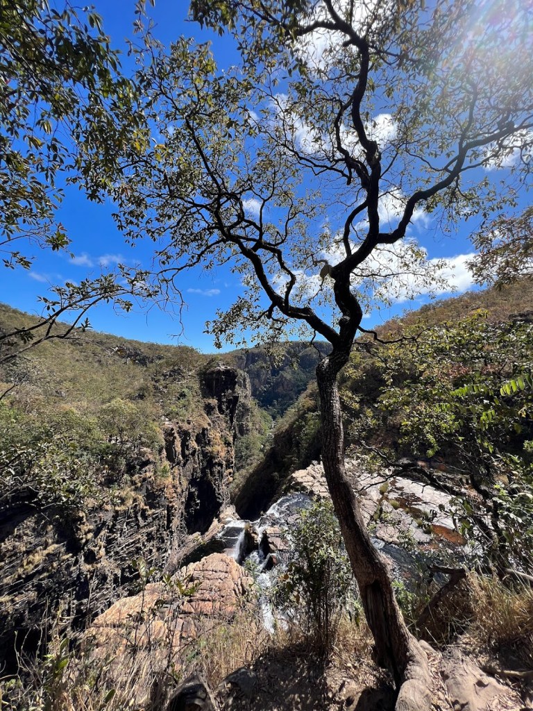 Depois que chegamos ao local onde os carros ficam estacionados, percorremos mais 6 km de uma trilha de nível médio, cansativa, acidentada e com muitas pedras. A parte inicial é plana e segue pela parte alta da Chapada. A vegetação de cerrado, com arbustos e pequenas árvores espalhadas e tortuosas, é uma companhia constante nessa caminhada.
