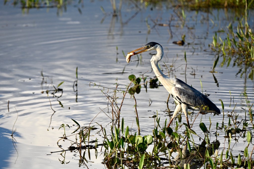 O maior espetáculo aconteceu com a chegada da Garça-moura, a maior das garças do Brasil, que pode chegar a 1,30 metros de altura e 1,80 metros de envergadura. É uma ave geralmente solitária, que se reúne apenas no período reprodutivo. Possui um voo lindo, em linha reta. Costuma pescar na beira das lagoas do Pantanal, onde fica pousada caçando peixes, rãs, sapos, caranguejos e pequenos répteis. Conseguimos um belo flagrante quando uma Garça-moura capturou um peixe que estava na mira de um Jacaré. Forma ninhais em grandes grupos, que podem chegar a 600 casais. Fazem os ninhos nas partes mais altas das árvores altas.