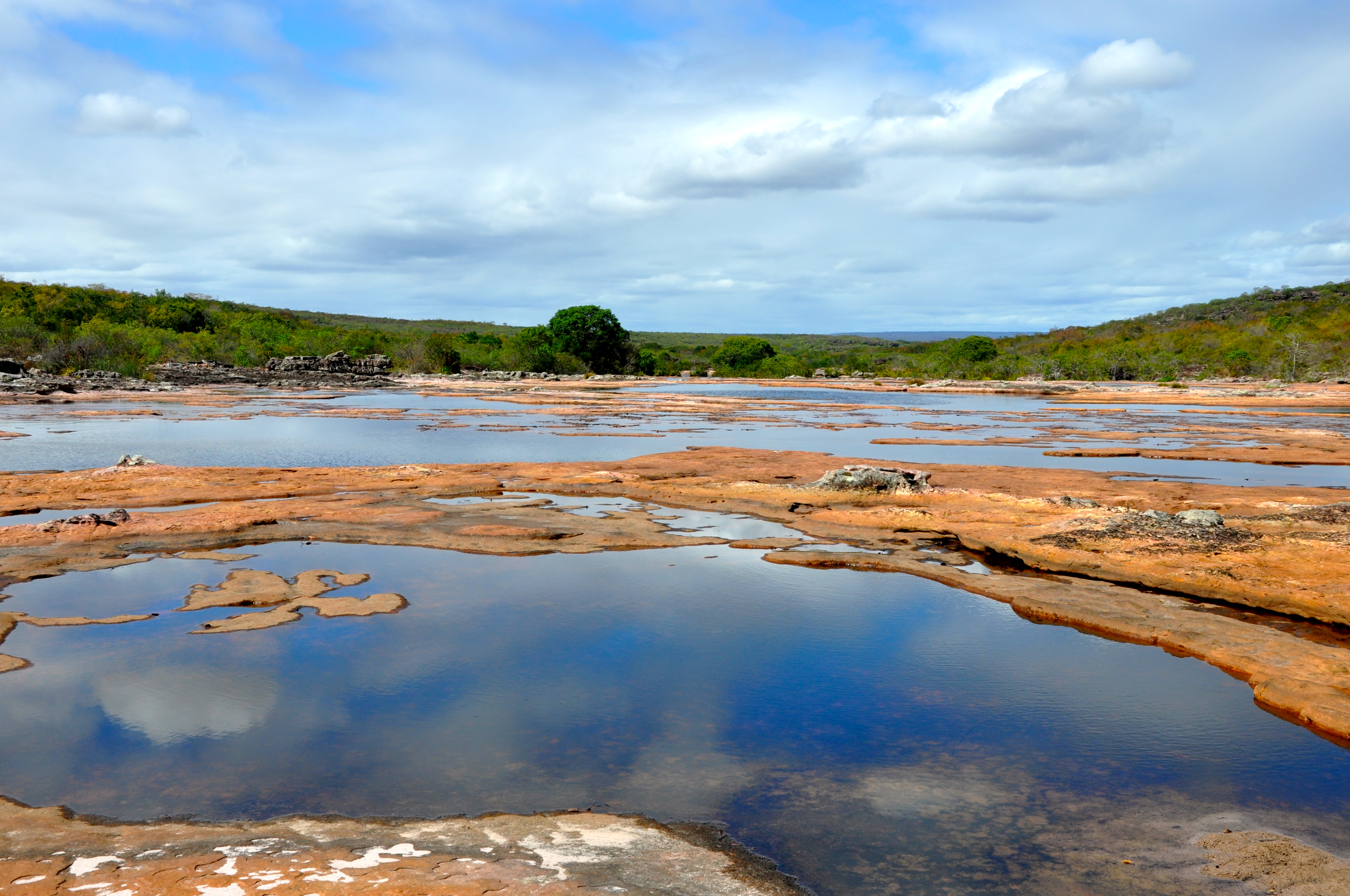 Deixamos o carro na entrada do Parque Municipal do Espalhado e seguimos andando. O caminho é muito bonito. A região é formada por um imenso lajedo, denominado de Espalhado. Seguimos bordejando o curso da água.