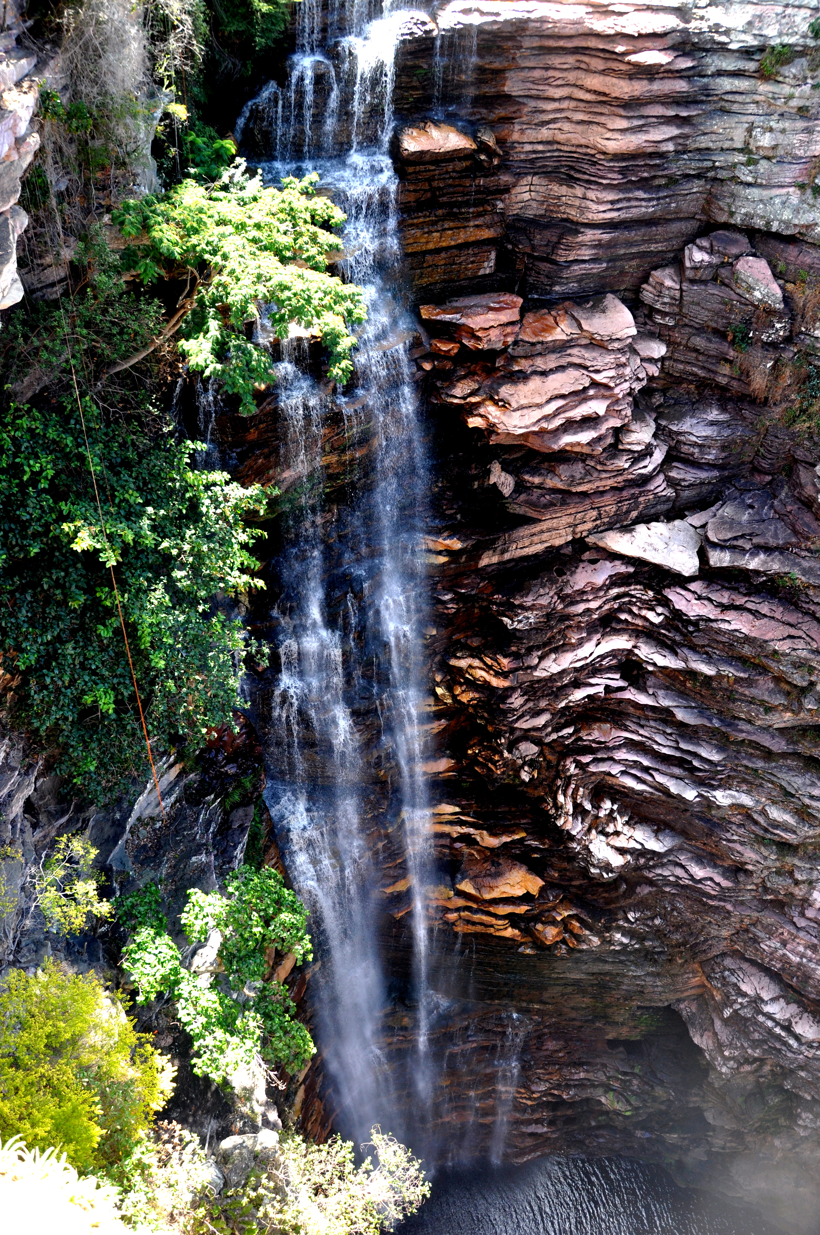 Andamos mais algumas centenas de metros e chegamos à parte alta da Cachoeira do Buracão. Ficamos na borda do precipício. Lá de cima dá para entender a magia do lugar. A natureza aqui foi perfeita e caprichosa. A cachoeira despenca de uma altura de 85m. É possível ficar bem na borda e ter uma sensação única da altura e do movimento das águas.