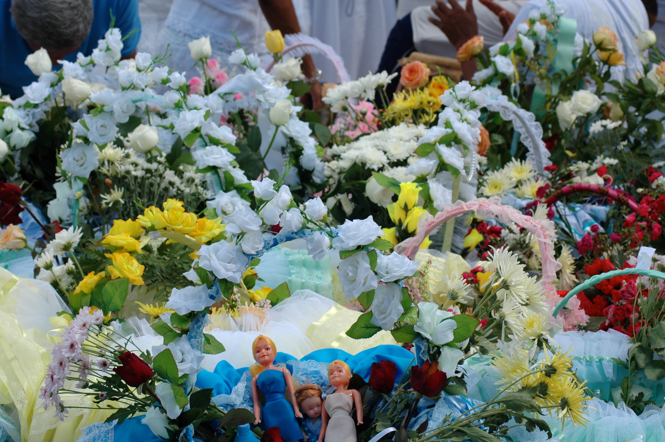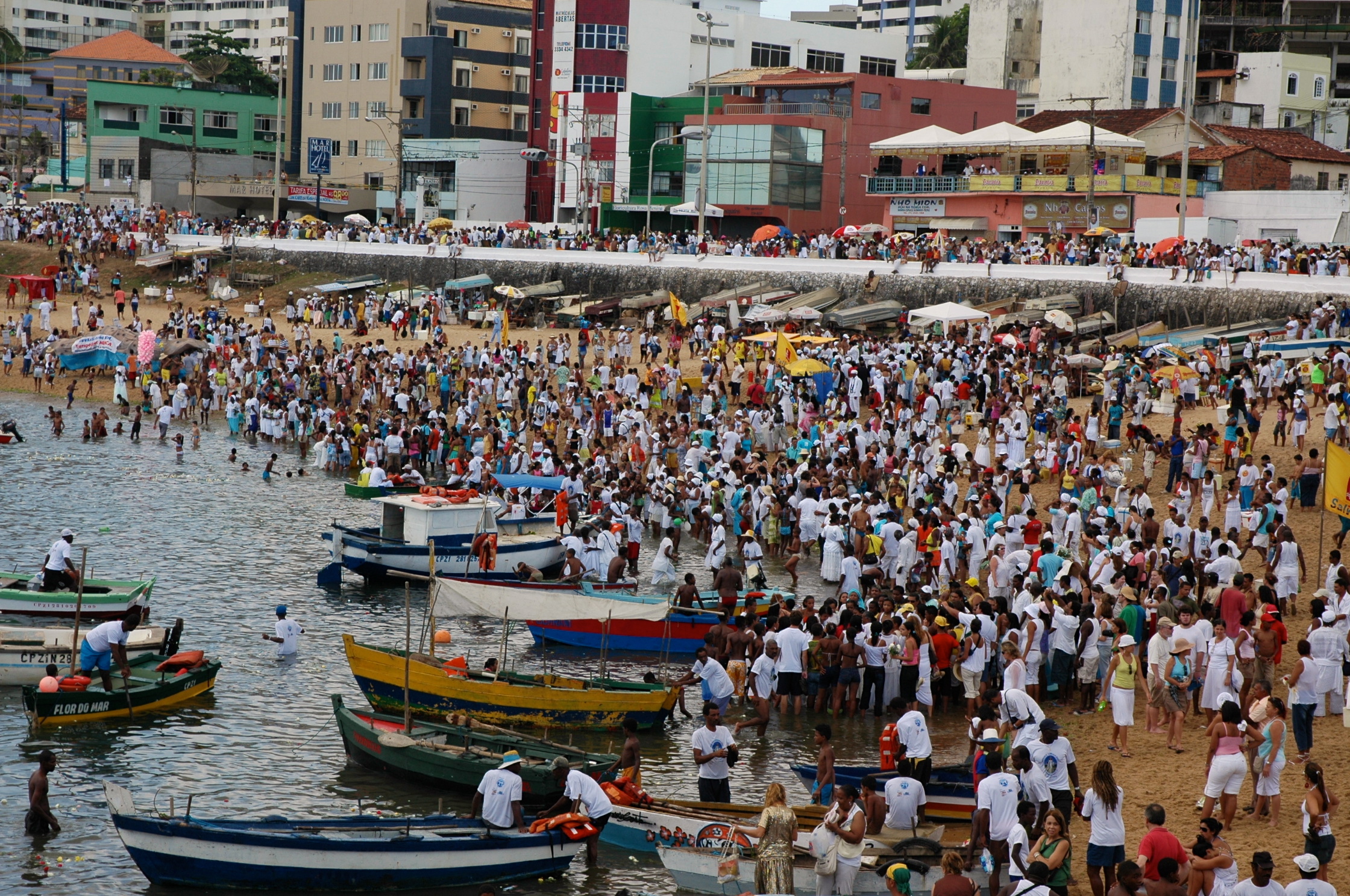 Manifestações de fé na Praia do Rio Vermelho.A festa é uma tradição que teve início em 1923, quando uma diminuição na produção do pescado fez com que um grupo de pescadores saíssem para alto mar, no dia 02 de fevereiro, para levar presentes para Iemanjá. Essa procissão passou a se repetir ano após ano e hoje, centenas de barcos acompanham o cortejo que leva os presentes para alto mar.