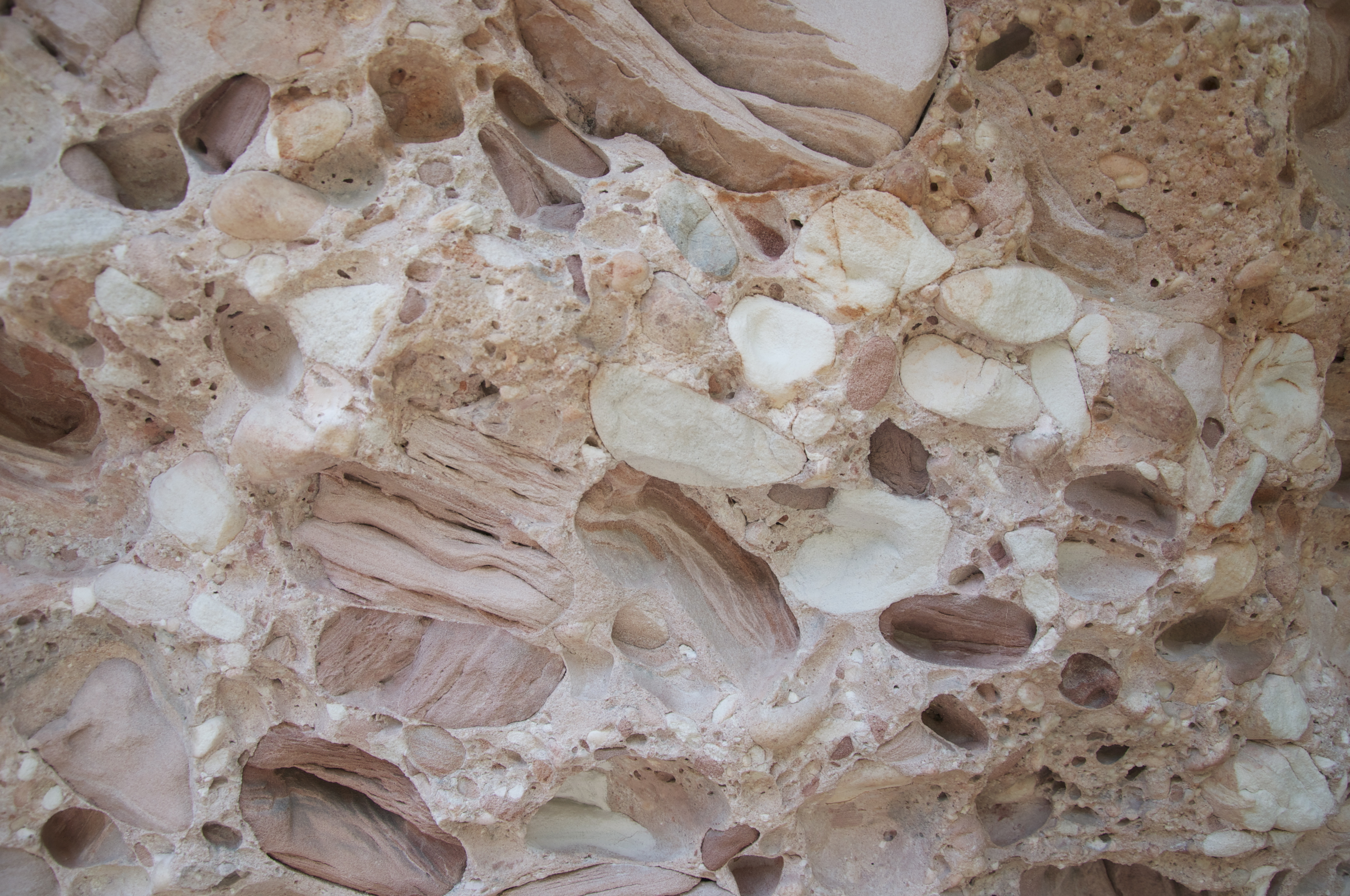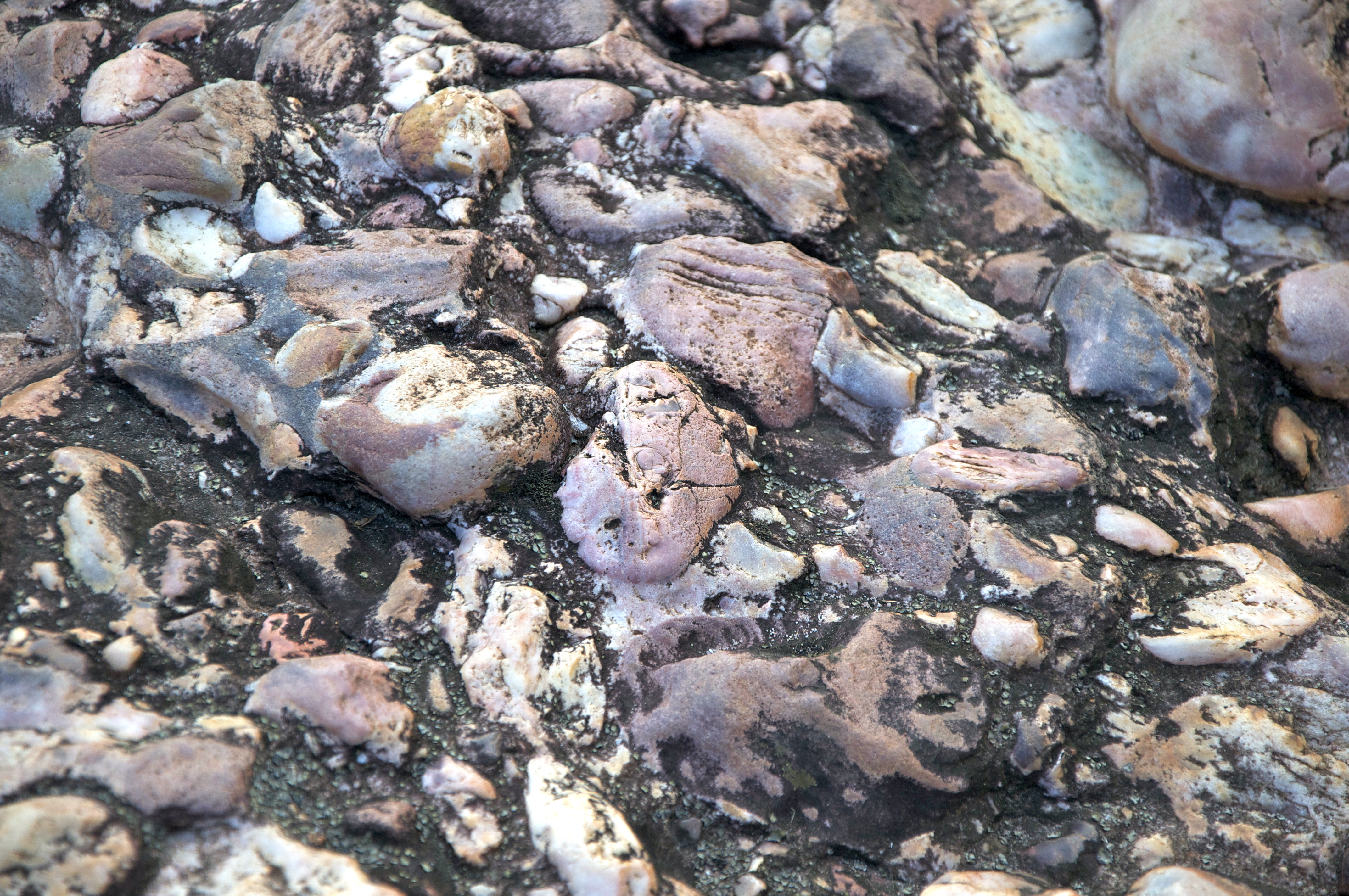 A água consolidou e poliu os seixos, criando formas interessantes. A rocha fica lisa, parecendo um mosaico colorido.