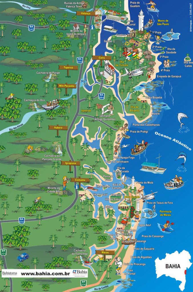 Chegamos em Bom Despacho e seguimos viagem através da BA 001 em direção à Costa do Dendê. A estrada atravessa a Ilha de Itaparica, cruza a Ponte do Funil que liga a Ilha ao continente, passa por Nazaré das Farinhas, Valença e depois segue por um mosaico de pequenos municípios até chegar a Camamu. Nos 100 primeiros quilômetros entre Bom Despacho e Valença a rodovia estava em bom estado. A partir daí, são mais 80 quilômetros de uma estrada sem manutenção, que passa por dentro das cidades da Costa do Dendê, com muitos quebra-molas e com muitos buracos na pista, que precisa ser percorrida com cuidado e atenção.