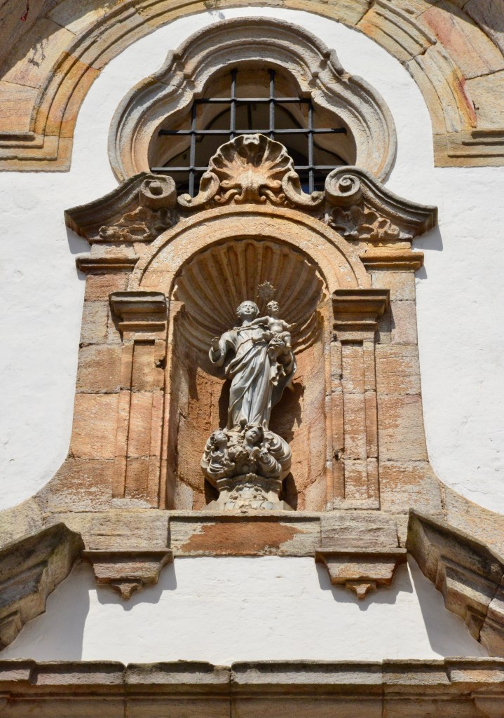 A imagem de Nossa Senhora do Rosário, em pedra-sabão, que fica na fachada, foi esculpida por Antônio Francisco Lisboa, o Aleijadinho.