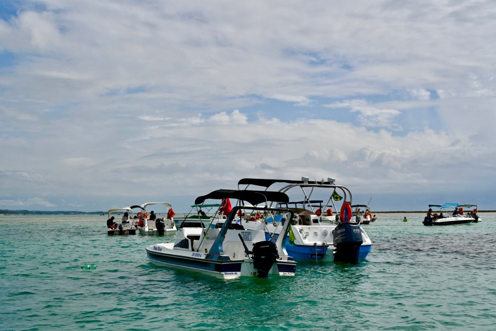 Nesse segundo dia na Praia de Antunes em Maragogi, Alagoas, alugamos uma lancha privativa e seguimos para as piscinas naturais. O serviço incluía um transporte até a Praia de Barra Grande, onde pegamos a lancha e seguimos adiante. As piscinas naturais seguem aquele pacote: Águas mornas, cristalinas e mar azul turquesa. O programa, porém, não é dos melhores. As piscinas naturais estavam lotadas, o piso não é de areia, os resíduos de corais estão por todas as partes e caminhar descalço chega a ser um sacrifício e desagradável.