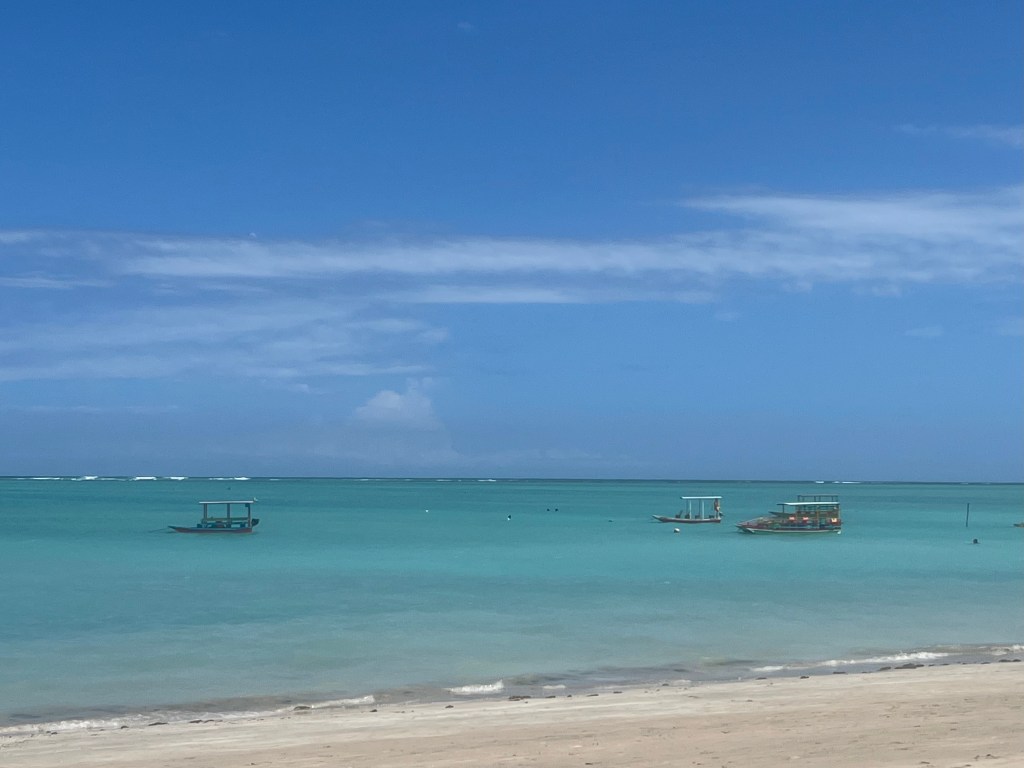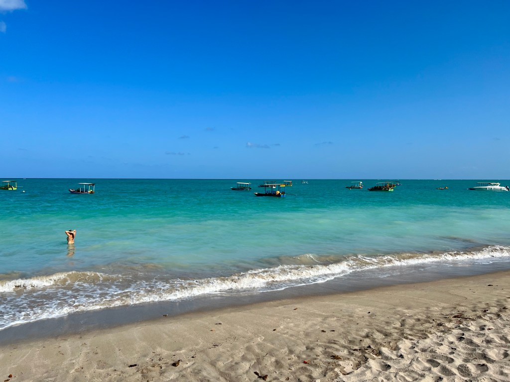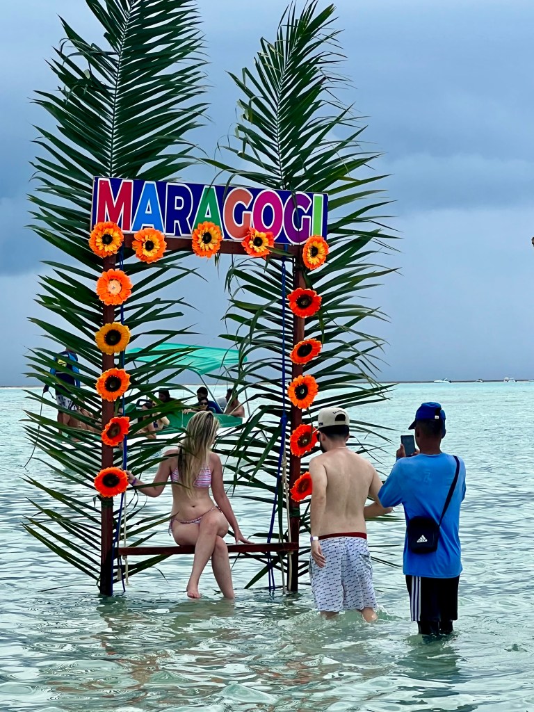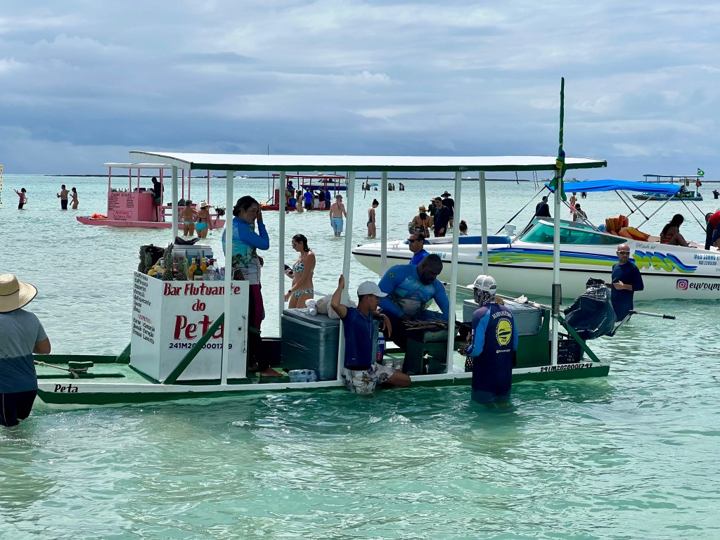 Saímos das piscinas naturais e fomos até um banco de areia famoso na região, chamado de Caminho de Moisés. O nome faz uma brincadeira com a possibilidade de caminhar por uma faixa de areia que rasga o mar. O lugar estava também lotado de lanchas e turistas. Muitos barcos disponibilizam serviços de alimentos e bebidas. Existem também serviços de locação de equipamentos de lazer, como canoas, stand up, pedalinhos, etc.