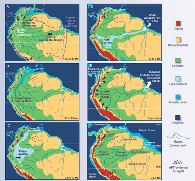 O boto-cor-de-rosa tem a sua origem no Oceano Pacífico. No passado geológico da Terra, quando a Cordilheira dos Andes começou a se erguer, as águas da atual Bacia Amazônica começaram a correr para o Atlântico. Os dois oceanos, que antes estavam interligados, começaram a se separar. Os botos ficaram aprisionados na Bacia Amazônica e se adaptaram a essa nova condição.