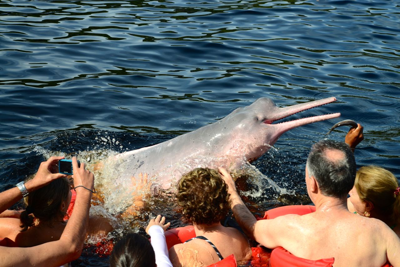 Os botos aparecem em toda a bacia amazônica. O local onde os encontramos é uma plataforma de observação comandada por caboclos. Ficamos sobre uma plataforma submersa onde demos peixes para os botos enquanto eles fazem acrobacias.