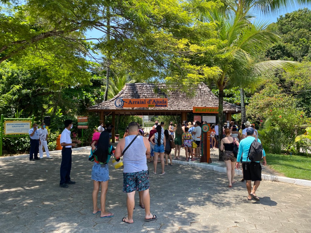 Os hóspedes do Arraial D’Ajuda Eco Resort possuem uma entrada de cortesia no Arraial D’Ajuda Eco Parque. É preciso fazer uma reserva prévia, na hora do check in do Resort e foi o que fizemos no dia anterior. O hotel nos levou de van até o Eco Parque e marcou um horário para a volta.