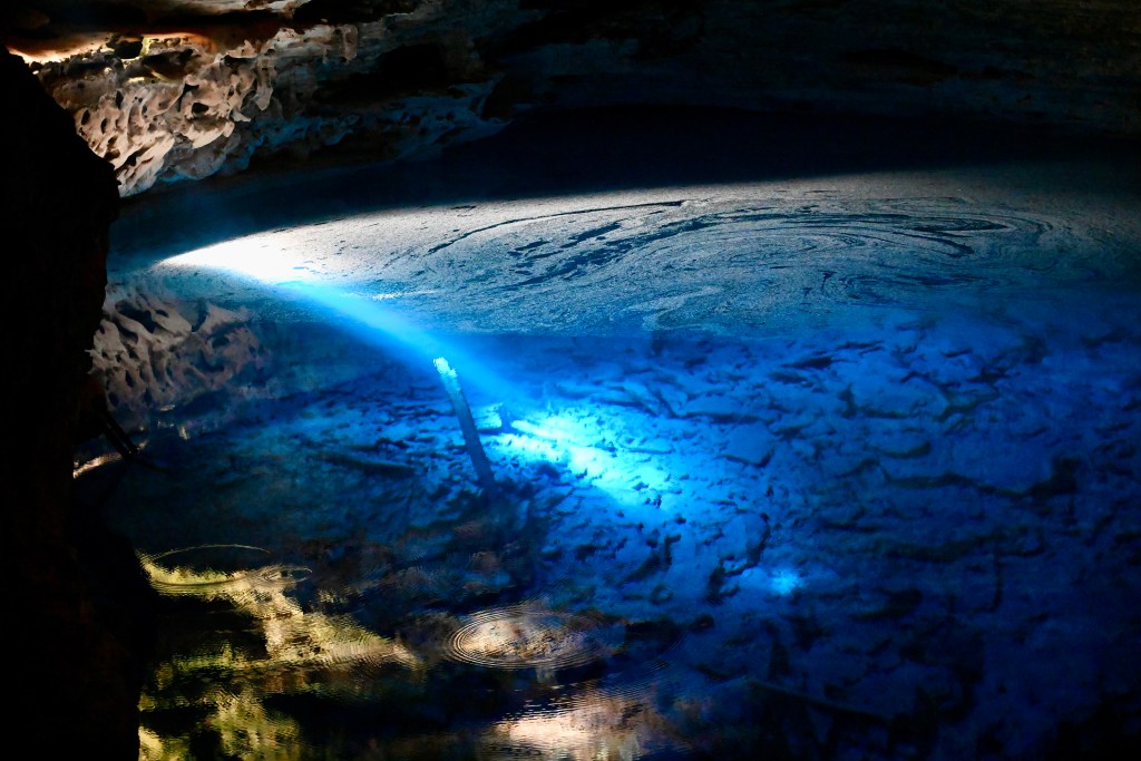 Dentro da gruta do Poço Encantado a água possui uma cor azul intensa e uma transparência única. Saber onde a água se encontra com o fundo da gruta é um exercício de todos que visitam o poço. Possui 65m de profundidade, mas a transparência da água é tão grande, que o fundo é visível com facilidade. Em determinado período do ano, outono e inverno, os raios de sol penetram no Poço e produzem um espetáculo mágico de luzes e cores. Nesse dia que fomos visitá-lo, esse fenômeno estava acontecendo.