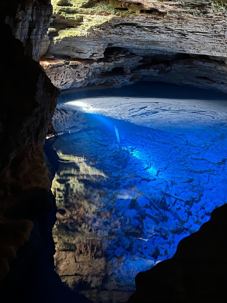 Deixamos o Cemitério Bizantino e seguimos para Lençóis, com a estratégia de fazer uma parada para visitar o Poço Encantado, uma daquelas coisas mágicas que a natureza constrói e nos dá de presente. É uma gruta localizada no Município de Itaetê, de beleza extraordinária. Durante vários anos ficou fechado à visitação, porém o Ibama autorizou a retomada das visitas, limitando o público e criando regras para que ela aconteça. Uma delas é que não é mais permitido nadar no Poço.