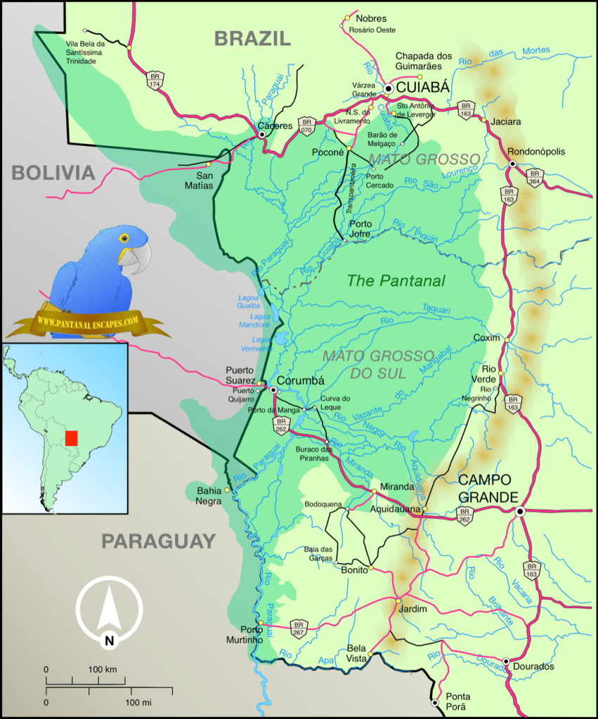 O Pantanal é uma extensa planície fluvial localizada na região central do Brasil (75% da sua área) e com áreas no leste da Bolívia e do Paraguai. No território brasileiro, está dividido entre o Mato Grosso (35% do território do estado) e o Mato Grosso do Sul (65% do território do estado). Possui 195 mil quilômetros quadrados de extensão, sendo que a maior parte, localizado em território brasileiro.