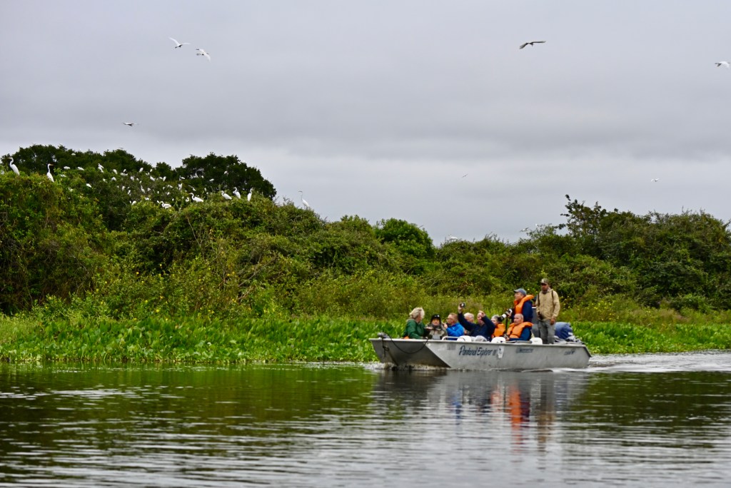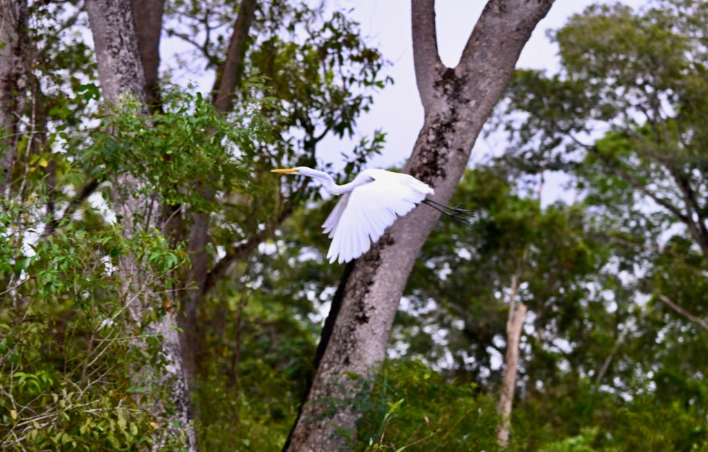 Seguimos adiante até o Rio Três Irmãos que compõe a hidrografia da região, com dezenas de outros rios e braços de rios. O espetáculo, por enquanto estava por conta dos ninhais de garças-brancas. Centenas delas voando para todos os lados. Essas garças costumam viver na beira dos rios e lagos do Pantanal. Chegam a medir pouco mais de um metro de altura.