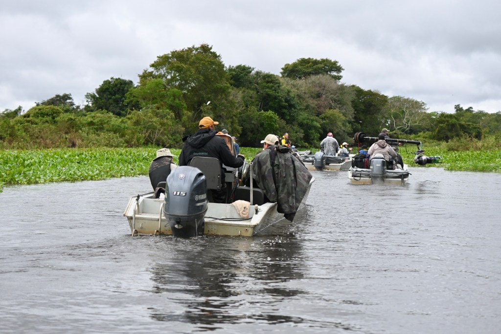 Pegamos uma lancha rápida com casco de alumínio, conduzida por um “piloteiro”, adaptada para safaris fluviais, e começamos a subir o Rio São Lourenço, na divisa entre os estados do Mato Grosso e Mato Grosso do Sul. O Rio São Lourenço é afluente do Rio Paraguai, o principal rio que corta o Pantanal do Mato Grosso. Havia uma névoa sobre a água, que deixava a manhã ainda mais enigmática.