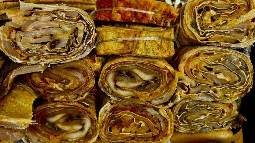 No Ver-o-Peso, é possível encontrar uma grande variedade de produtos típicos da Amazônia, que refletem a riqueza da culinária e da cultura paraense. O jambu é uma erva de sabor peculiar, famosa por causar uma leve dormência na boca e muito utilizada no tradicional tacacá, uma sopa quente à base de tucupi e camarão. O tucupi, por sua vez, é um caldo amarelo extraído da mandioca brava, de sabor ácido e intenso, essencial em pratos típicos como o próprio tacacá e o pato no tucupi. A maniçoba, conhecida como a “feijoada paraense”, é feita com folhas de mandioca trituradas e cozidas por vários dias para eliminar toxinas, misturadas a carne de porco e charque. Além disso, o mercado oferece frutas exóticas como o cupuaçu, de polpa cremosa e aroma marcante, utilizado em doces e sucos, e o açaí, consumido tradicionalmente com farinha de tapioca ou peixe frito.