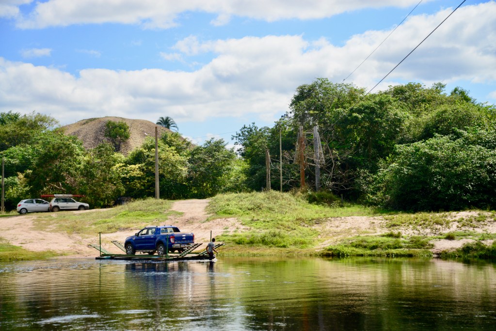 Nesse período que fomos para a Chapada, o Rio Paraguaçu estava bem vazio e a travessia era de aproximadamente 300 metros entre as duas margens. Existem momentos, porém, que o rio pode estar cheio e a travessia fica mais complexa. Estávamos em dois carros. A balsa leva um carro por vez. Deu tudo certo, em meia hora estávamos do outro lado do rio e seguimos para o Poço Encantado.