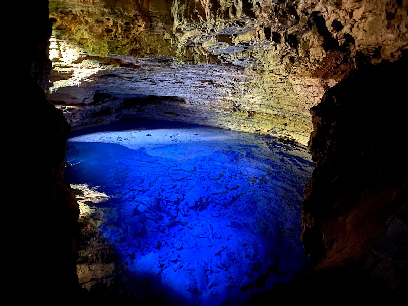 Dentro da gruta do Poço Encantado a água possui uma cor azul intensa e uma transparência única. Saber onde a água se encontra com o fundo da gruta é um exercício de todos que visitam o poço.