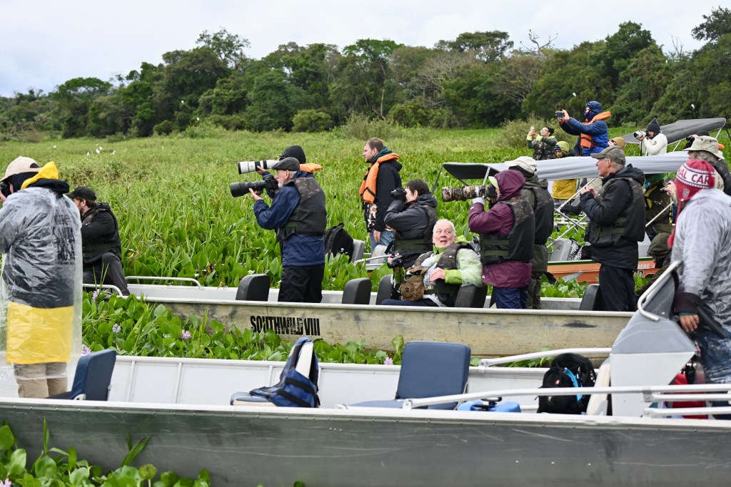 Depois de estarmos hospedados na Santa Rosa, saímos à tarde para o primeiro safari fluvial, a bordo de uma lancha rápida com casco de alumínio. O barco sobe o Rio Cuiabá, por uma hora e meia, até encontrar braços de rios e afluentes, nas áreas de maior probabilidade para avistagem de onças-pintadas. O frio estava intenso. Havia chegado uma frente fria que nos surpreendeu.