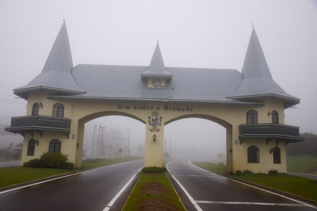 Depois iniciamos a subida da Serra e chegamos a Gramado. O pórtico da entrada da cidade já nos recebe com um charme especial. Nessa época do ano as hortênsias estão queimadas e isso diminui um pouco a beleza da entrada da cidade.
