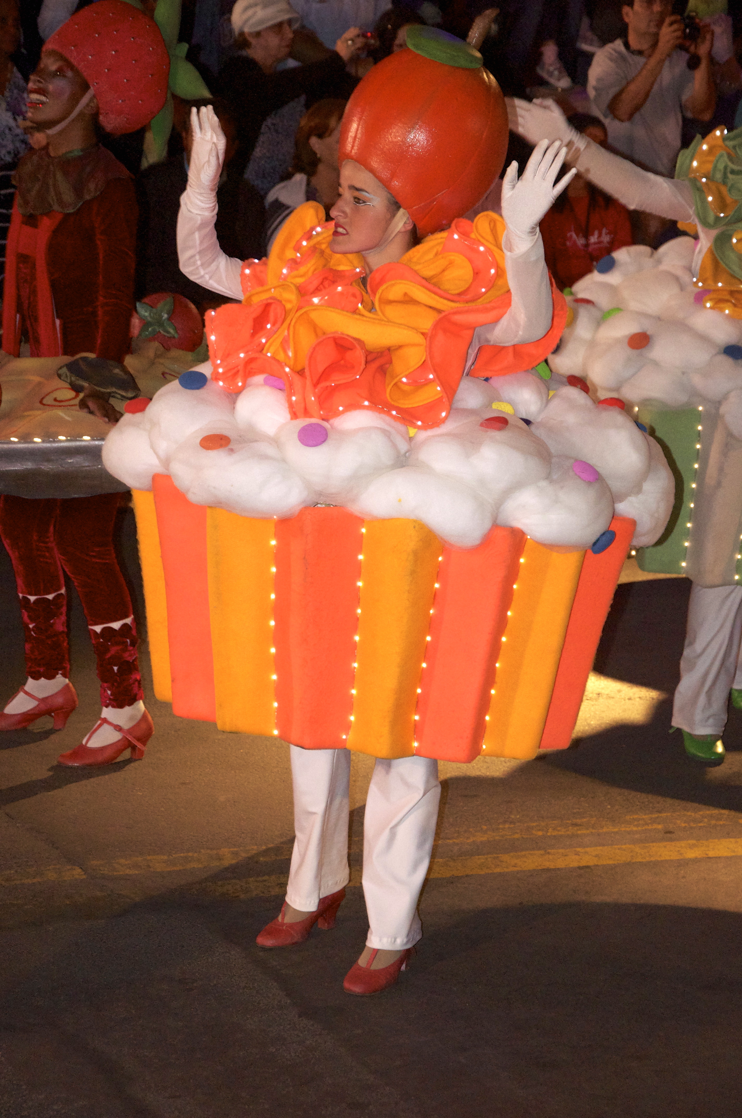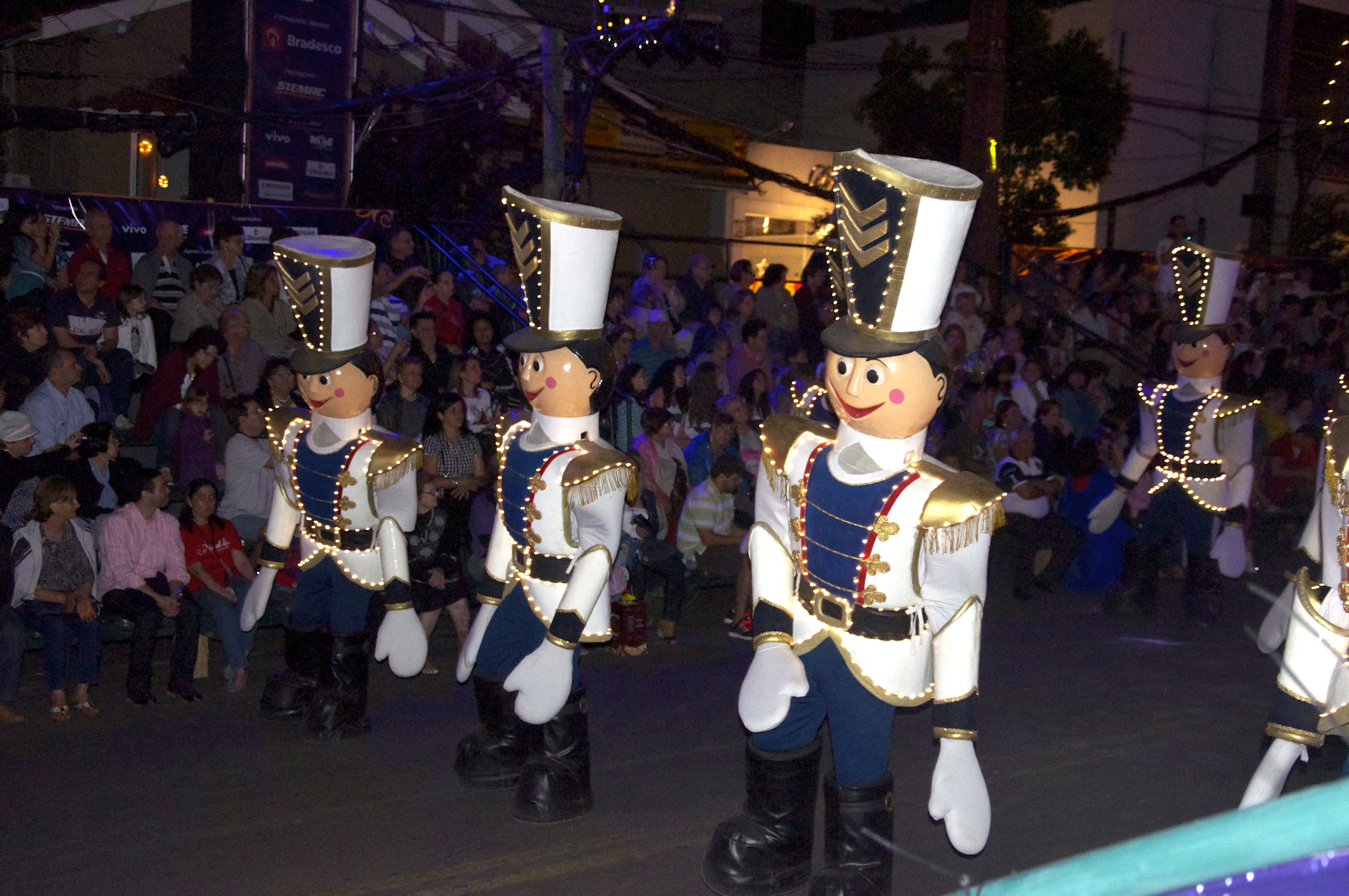 Passamos no hotel para um banho rápido e seguimos para a Rua da Hortênsias, no centro da cidade, onde acontece o desfile. Boa parte da rua fica interditada e são montadas arquibancadas para o público que adquire os ingressos. O Natal Luz é um excelente exemplo de uso do espaço público com atividades privadas.
