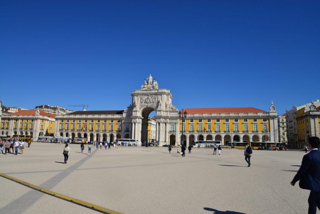 Hoje tivemos o nosso último dia na viagem. Foram duas horas para curtir um pouco os arredores do centro histórico de Lisboa. Saímos andando do Hotel Pestana CR7 e fomos até a bela Praça do Comércio, ao lado do Rio Tejo. A Praça ocupa uma imensa área ao lado do Rio Tejo. Fica no local do antigo Palácio Real, destruído pelo Terremoto de Lisboa de 1755.