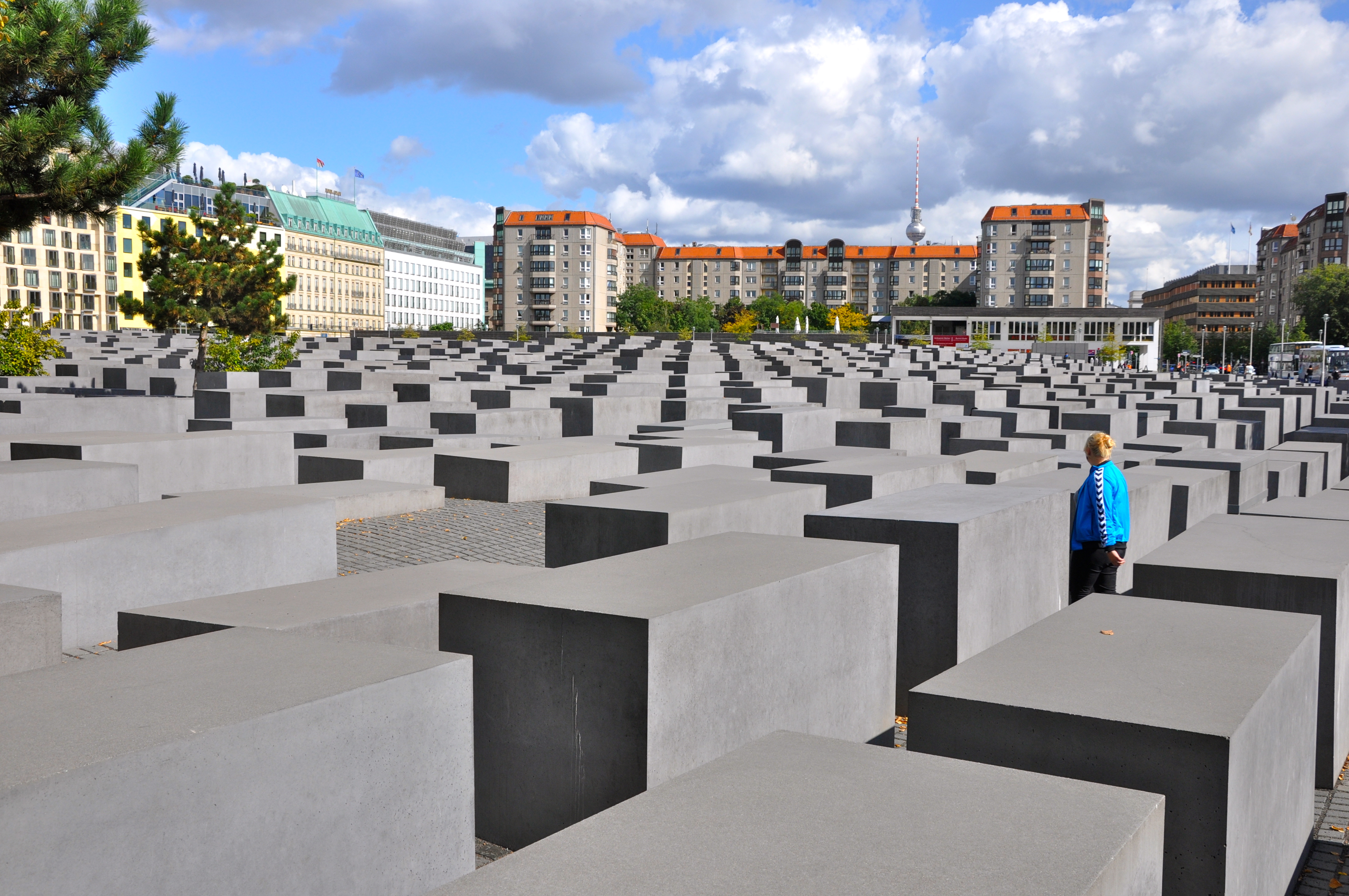 Deixamos as malas no hotel e fomos “bater pernas” nos arredores. Seguimos em direção ao Portão de Brandemburgo e no caminho passamos pelo Memorial do Holocausto, ou Memorial aos Judeus Mortos na Europa durante a Segunda Guerra Mundial. O memorial consiste de uma área com 19.000 metros quadrados, com 2.711 blocos de concreto com alturas variadas. Está encravado no coração de Berlim.