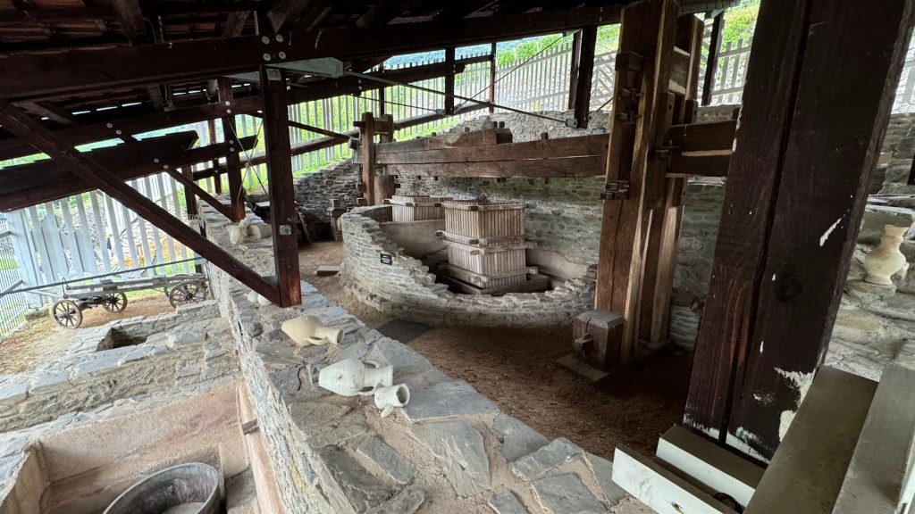 A parada seguinte foi na região de Piesport, 8 Km adiante. Local colonizado pelos romanos e onde a viticultura foi introduzida desde o início da era cristã. Fomos visitar as ruínas romanas associadas à produção de vinhos desde aquela época. Uma grande instalação de prensagem de uvas para a produção de vinhos foi descoberta em 1985, parcialmente reconstruída e preservada.
