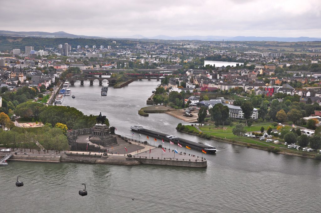 Dentre os destaques, aparece exatamente na confluência dos rios, a enorme estátua equestre do imperador Guilherme I. Ao lado da estátua aparece o Ludwig Museum, instalado num prédio que pertencia à Ordem dos Cavaleiros Teutônicos e que possui um acervo de arte moderna.