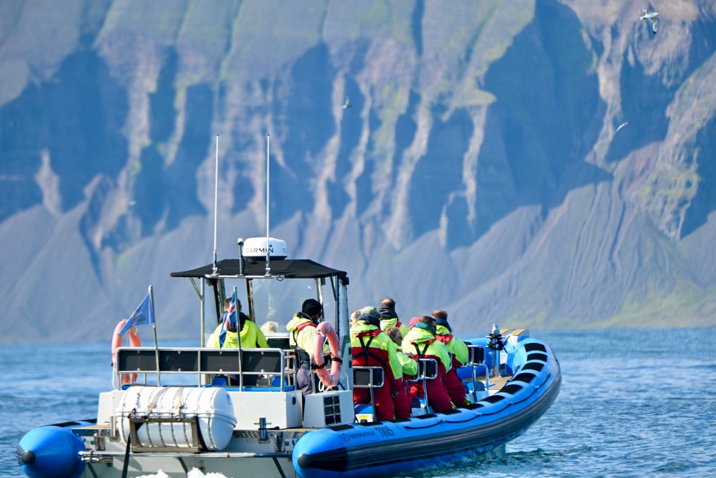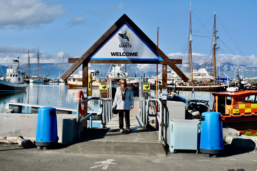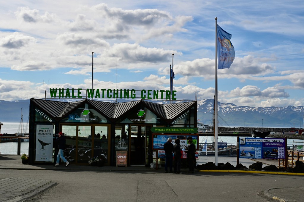 Finalmente chegamos ao porto abrigado de Husavik e o tempo melhorou. O fiorde onde fica o porto cria uma condição ideal para atracação. A expectativa para o programa em Husavik era grande. Esse é o melhor lugar da Islândia para avistagem de baleias. Não conseguimos vagas nas excursões que estavam disponibilizadas para os hóspedes, mas não foi difícil encontrar um programa alternativo e semelhante, no cais do porto.