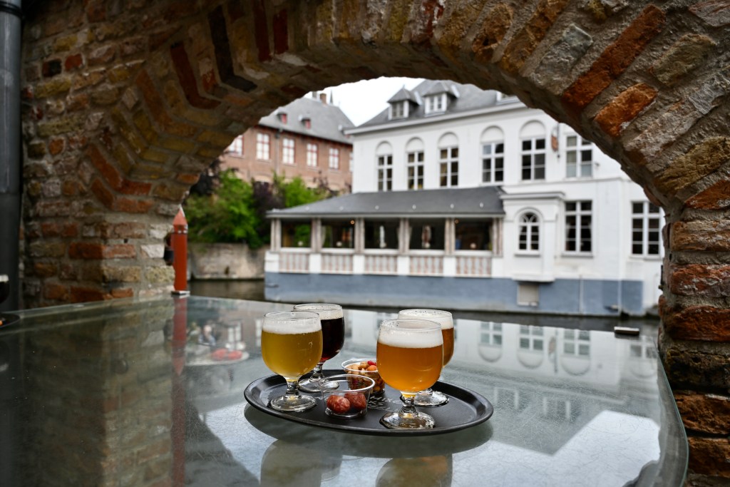 Depois do passeio, continuamos andando e paramos na loja de cervejas 2be, um ícone de Bruges e um paraíso para os amantes da cerveja. Fica num dos casarões do centro histórico. É um local para comprar cervejas belgas especiais, comprar suvenires associados às cervejas, ou simplesmente se sentar numa mesinha no terraço, na beira do canal, provar um tira-gosto enquanto degusta um menu de cervejas. Essa é a melhor alternativa.